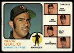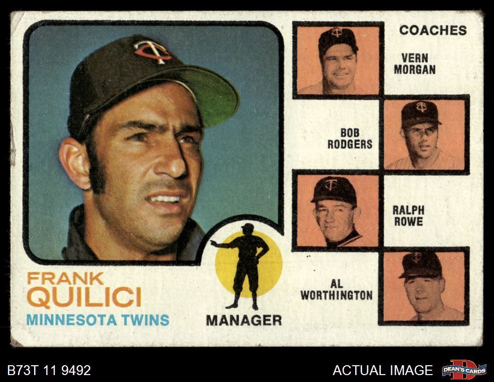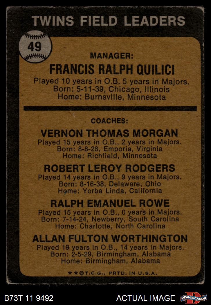 1973 Topps #49 BRN - Frank Quilici / Vern Morgan / Bob Rodgers / Ralph Rowe / Al Worthington Twins Leaders 1 - POOR