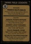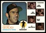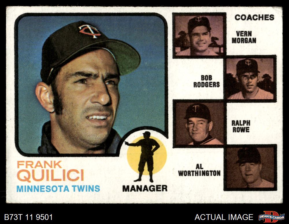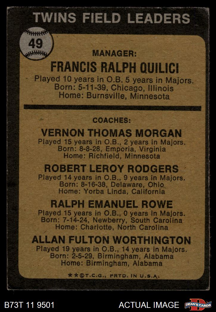 1973 Topps #49 BRN - Frank Quilici / Vern Morgan / Bob Rodgers / Ralph Rowe / Al Worthington Twins Leaders 4 - VG/EX