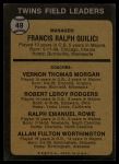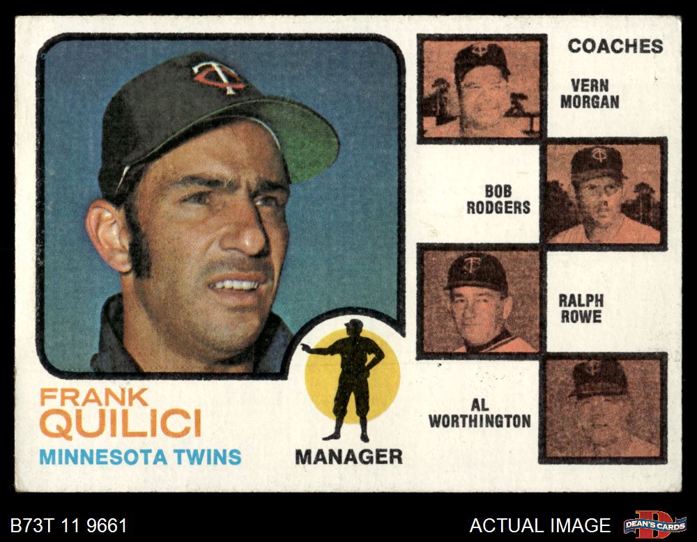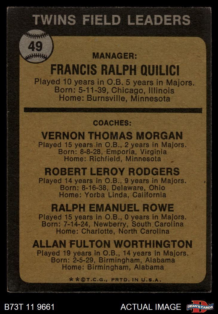 1973 Topps #49 BRN - Frank Quilici / Vern Morgan / Bob Rodgers / Ralph Rowe / Al Worthington Twins Leaders 5 - EX