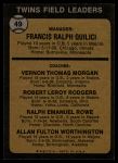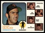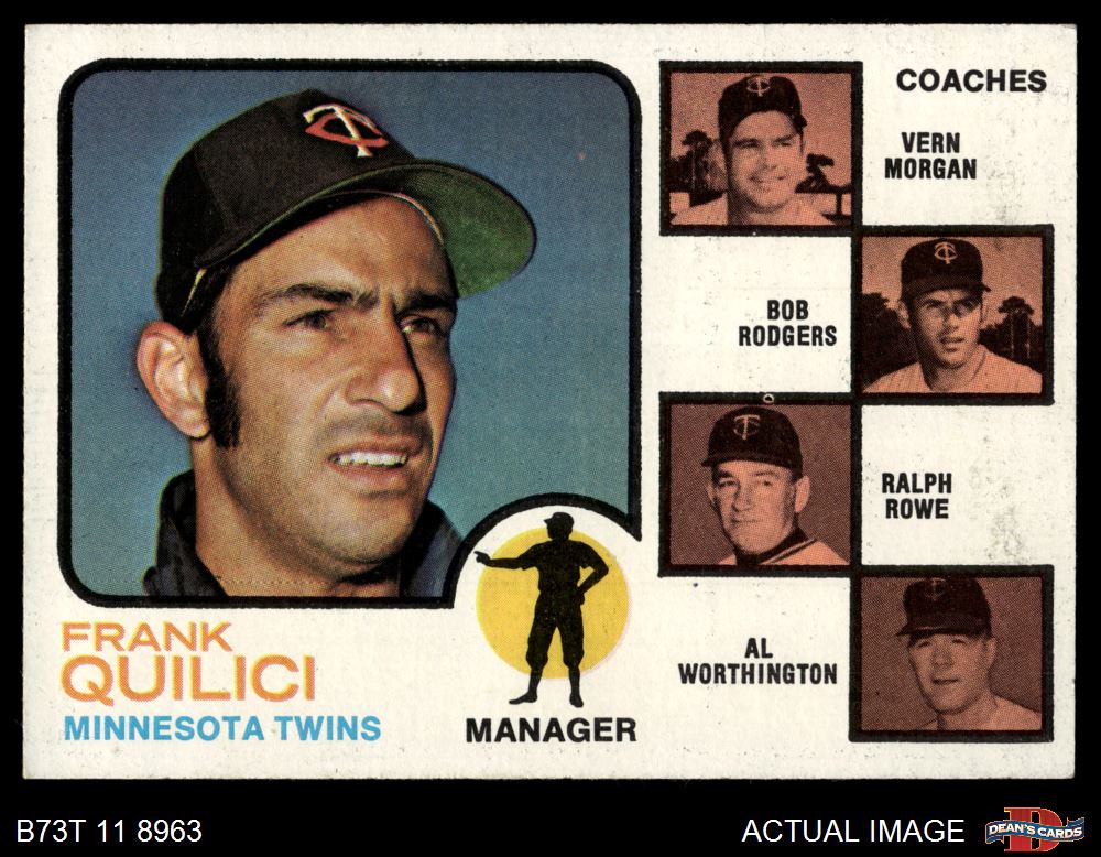 1973 Topps #49 BRN - Frank Quilici / Vern Morgan / Bob Rodgers / Ralph Rowe / Al Worthington Twins Leaders 6 - EX/MT