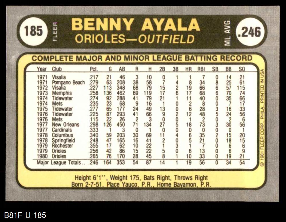 1981 Fleer #185 Benny Ayala 8 - NM/MT
