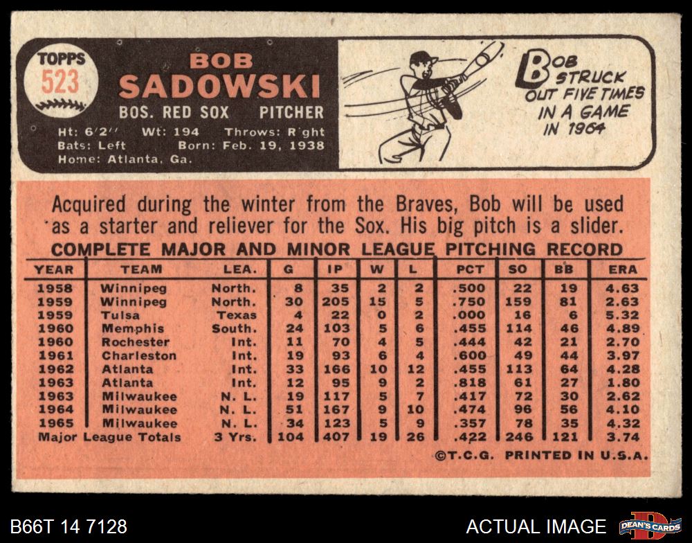1966 Topps #523 Bob Sadowski 4 - VG/EX