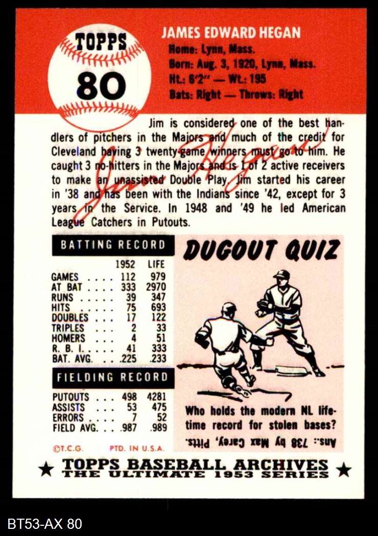 1953 Topps Archives #80 Jim Hegan 8 - NM/MT