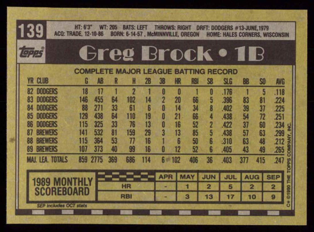 1990 Topps #139 Greg Brock 8 - NM/MT