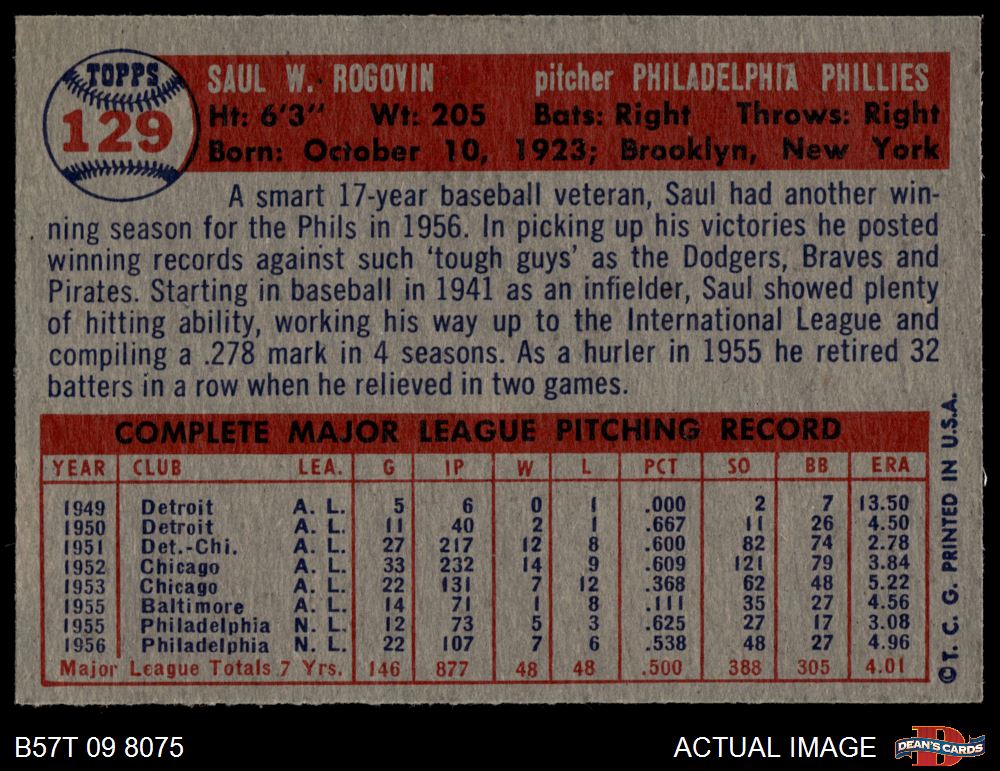 1957 Topps #129 Saul Rogovin 7.5 - NM+