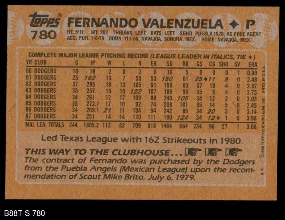 1988 Topps #780 Fernando Valenzuela 8 - NM/MT