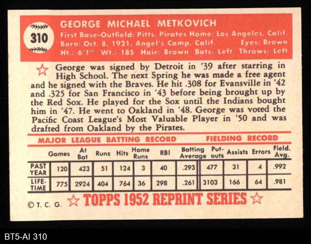 1952 Topps REPRINT #310 George Metkovich 8 - NM/MT