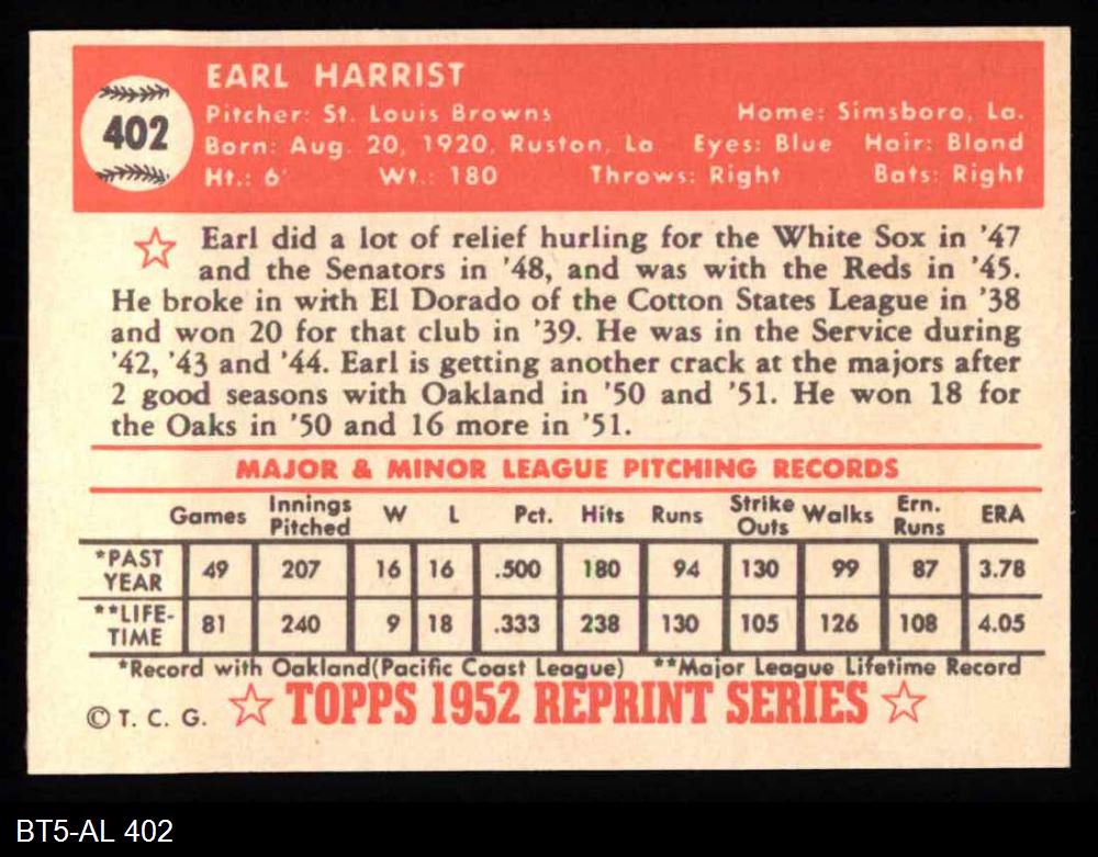 1952 Topps REPRINT #402 Earl Harrist 8 - NM/MT