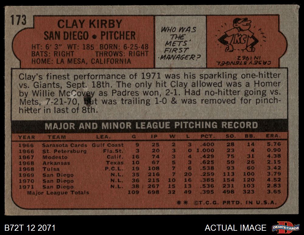 1972 Topps #173 Clay Kirby 3 - VG