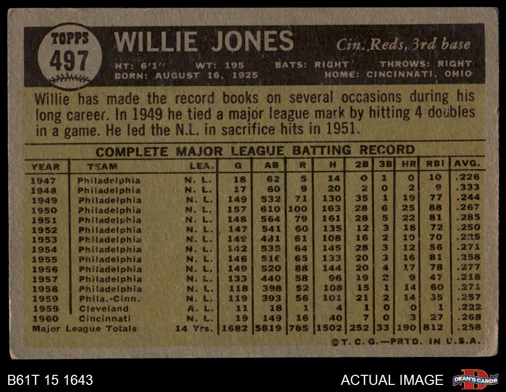 1961 Topps #497 Willie Jones 1.5 - FAIR
