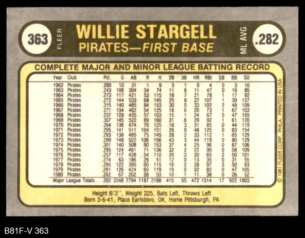 1981 Fleer #363 Willie Stargell 8 - NM/MT