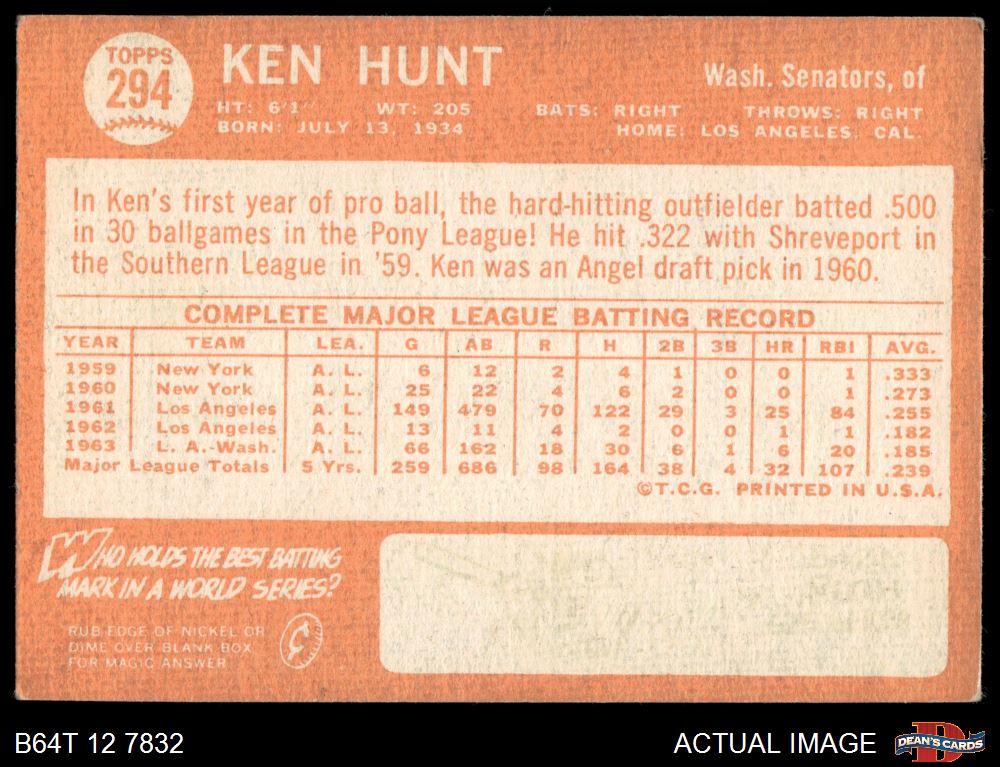 1964 Topps #294 Ken Hunt 3.5 - VG+