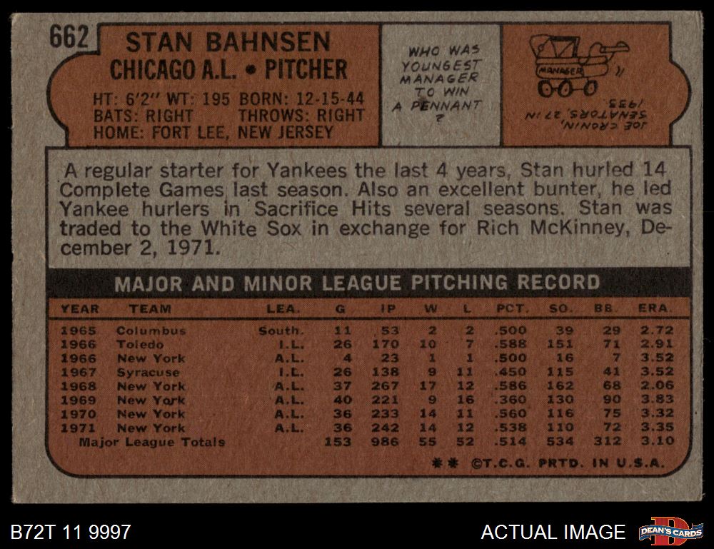 1972 Topps #662 Stan Bahnsen 4 - VG/EX