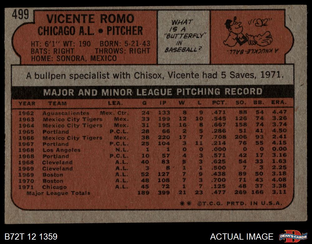 1972 Topps #499 Vicente Romo 2 - GOOD