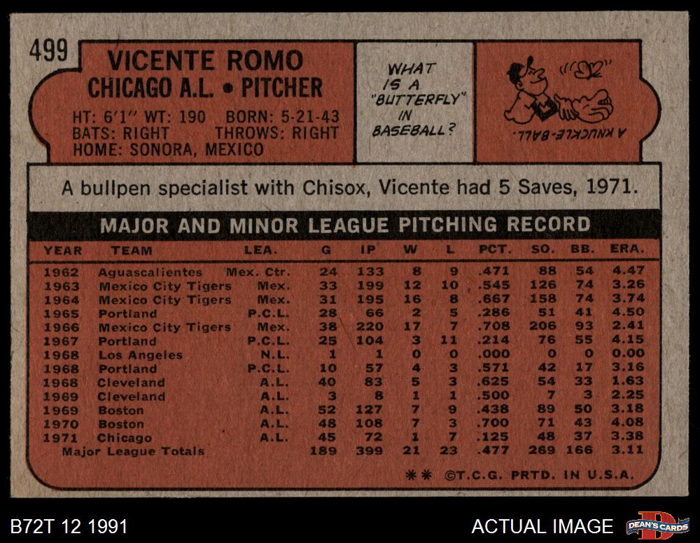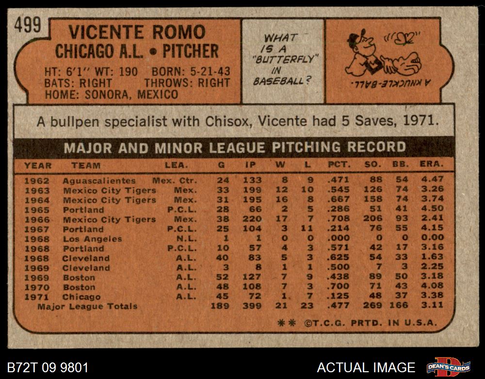 1972 Topps #499 Vicente Romo 5 - EX