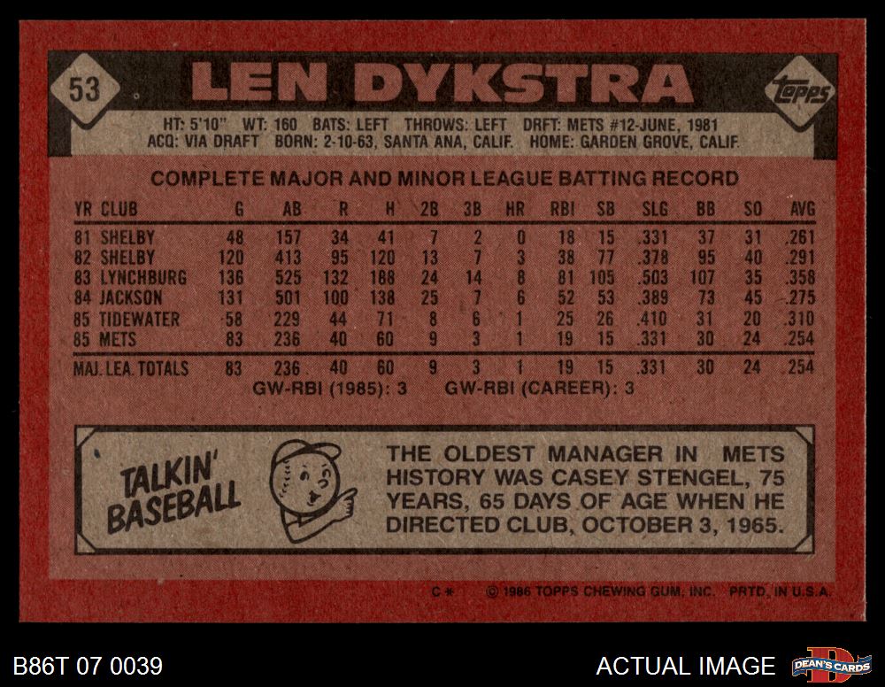 1986 Topps #53 Len Dykstra 8 - NM/MT