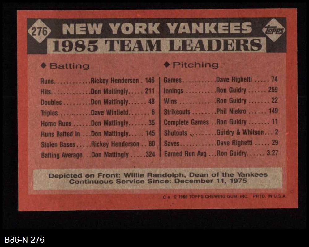 1986 Topps #276 Yankees Leaders