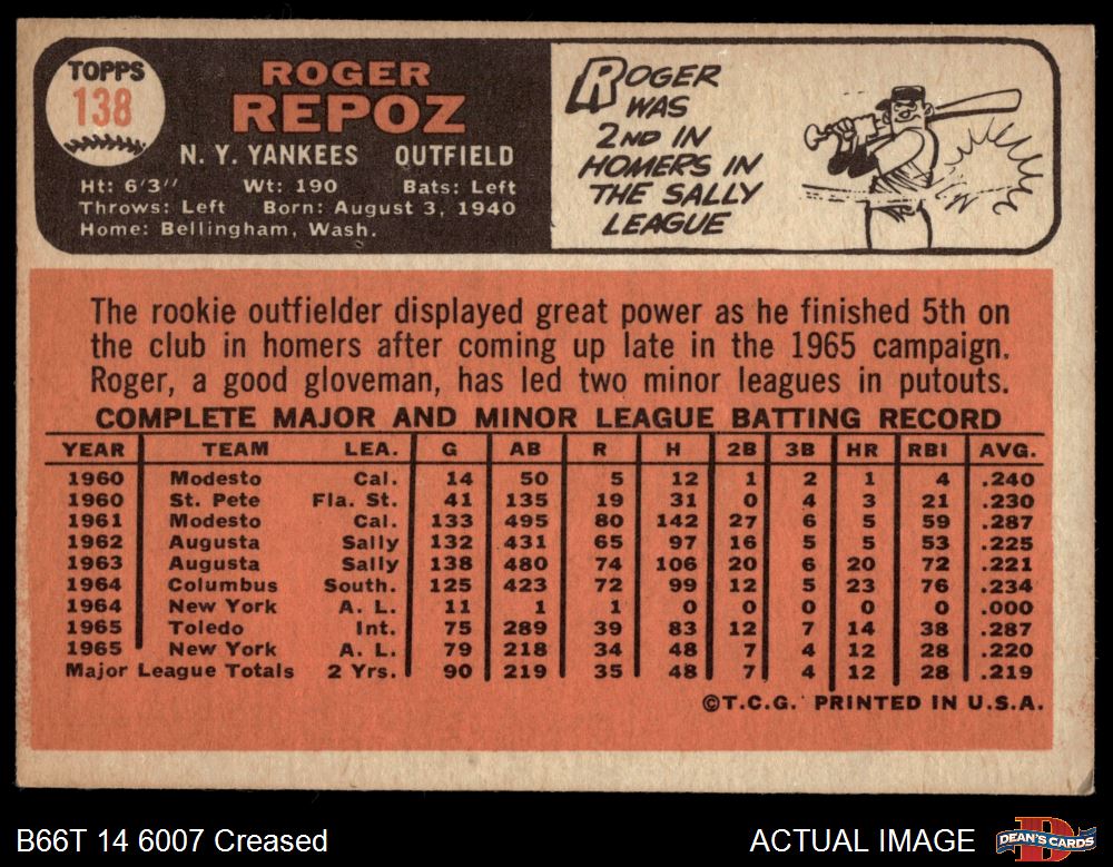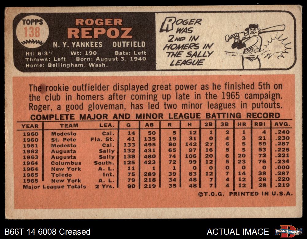 1966 Topps #138 Roger Repoz 2 - GOOD