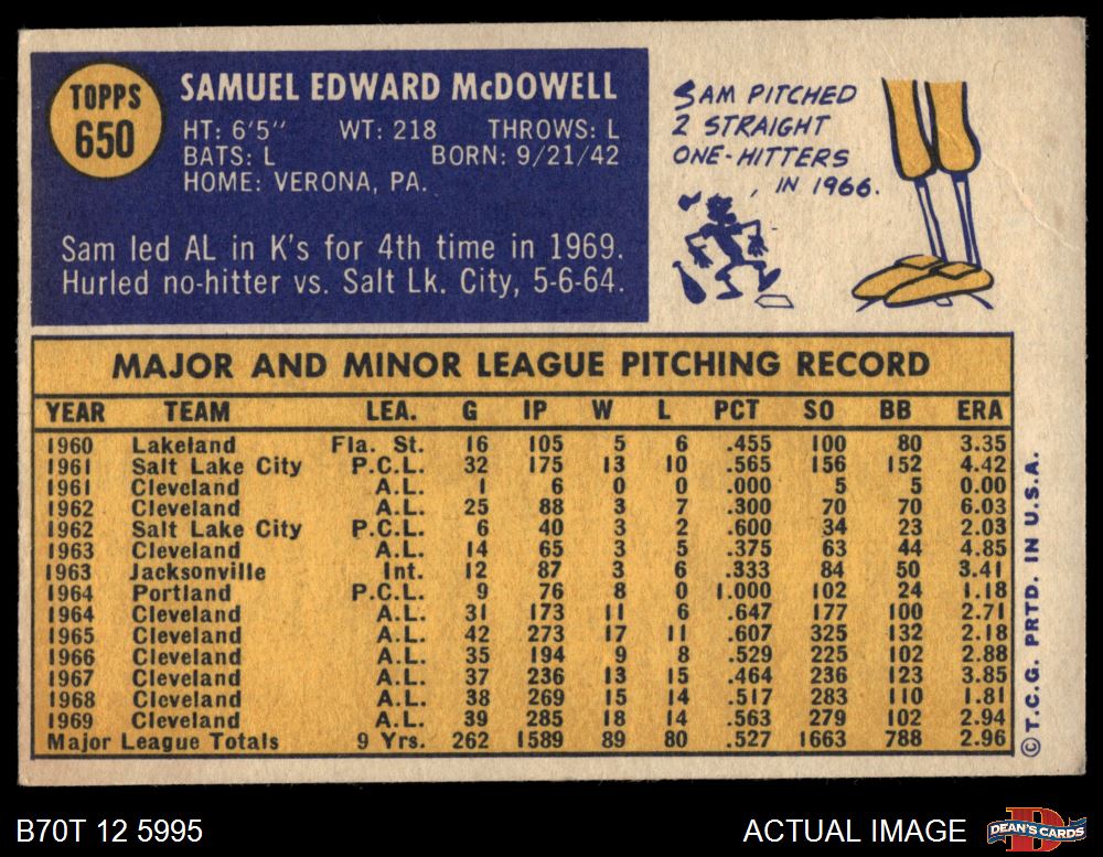 1970 Topps #650 Sam McDowell 4 - VG/EX