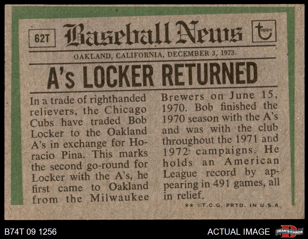 1974 Topps Traded #62 T - Bob Locker Traded 6 - EX/MT