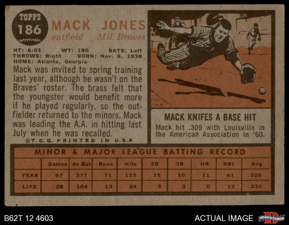 1962 Topps #186 GRN Mack Jones 3 - VG