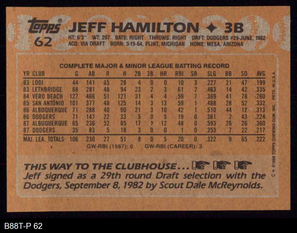 1988 Topps #62 Jeff Hamilton 8 - NM/MT