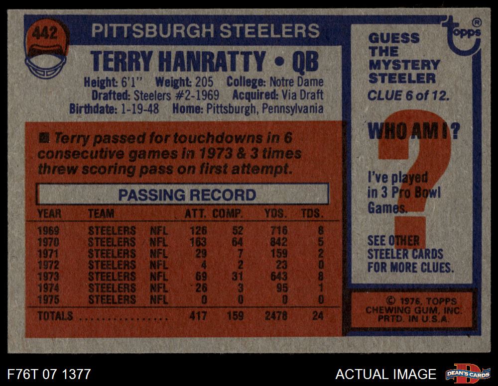 1976 Topps #442 Terry Hanratty 5 - EX
