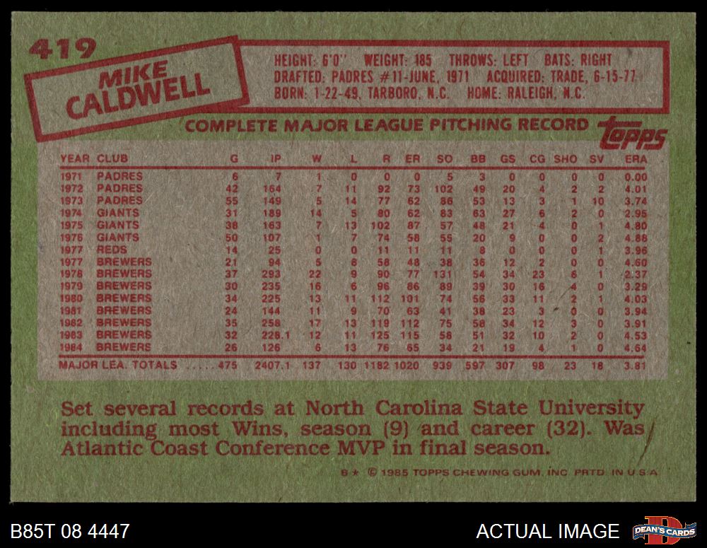 1985 Topps #419 Mike Caldwell 8 - NM/MT