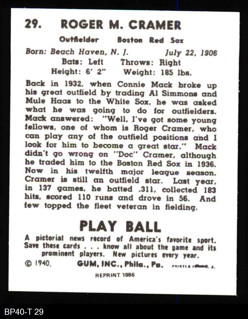 1940 Play Ball Reprint #29 Doc Cramer 8 - NM/MT