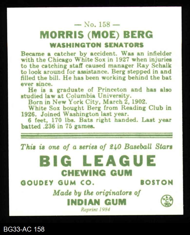 1933 Goudey Reprint #158 Moe Berg 8 - NM/MT