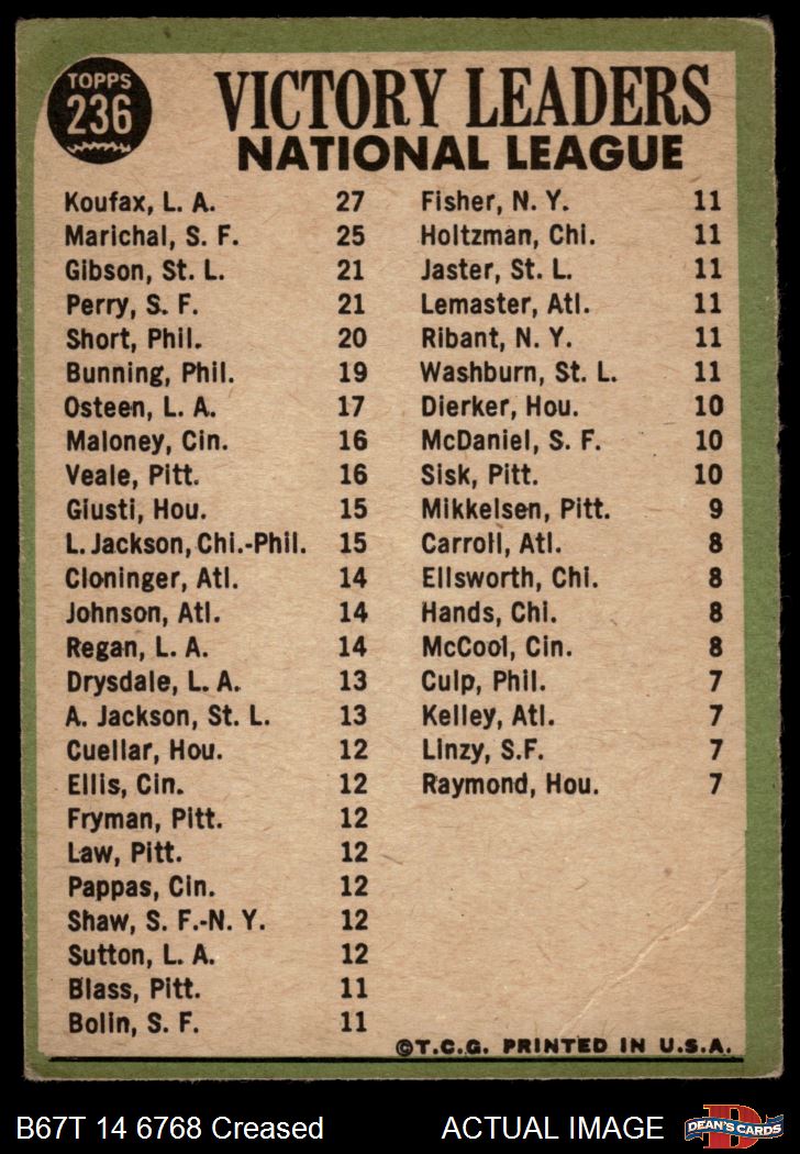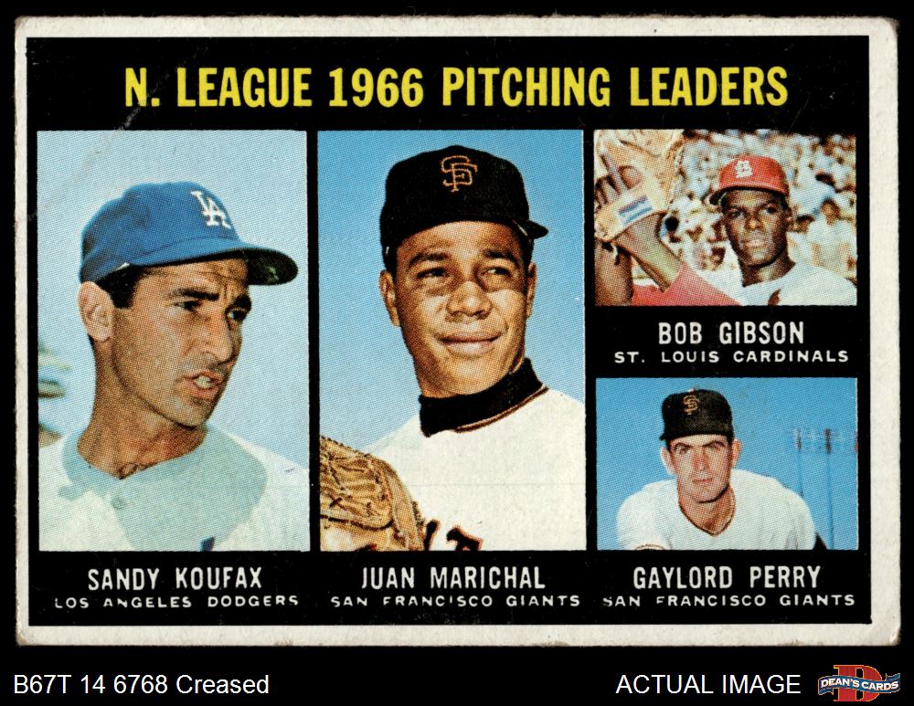 1967 Topps #236 - Bob Gibson / Sandy Koufax / Juan Marichal / Gaylord Perry NL Pitching Leaders 2 - GOOD