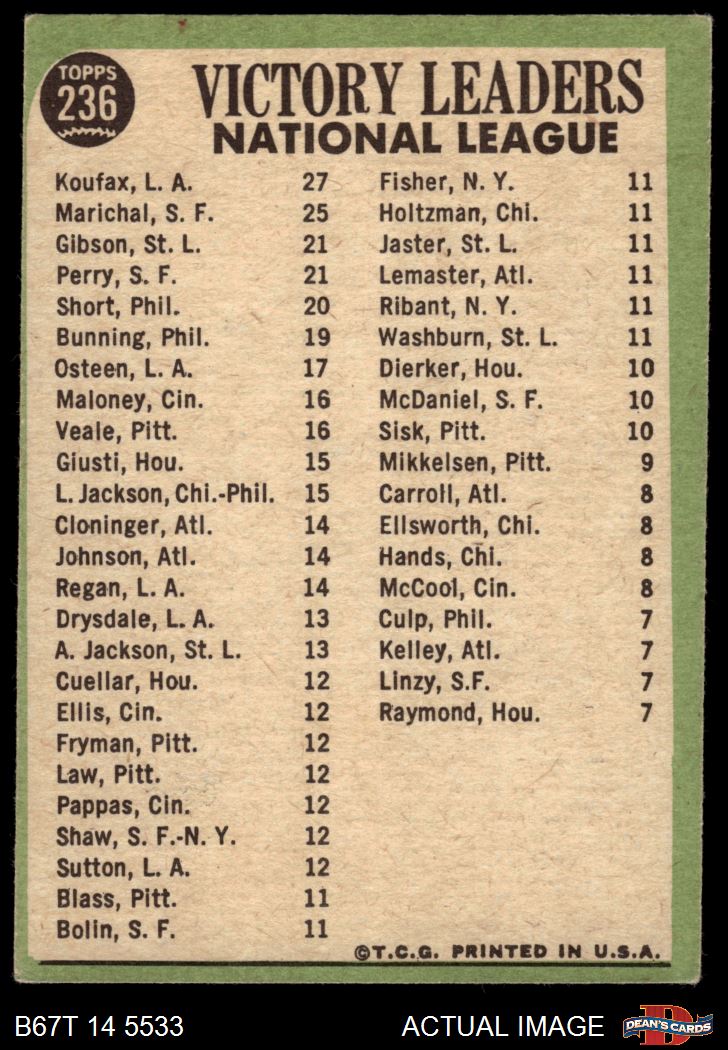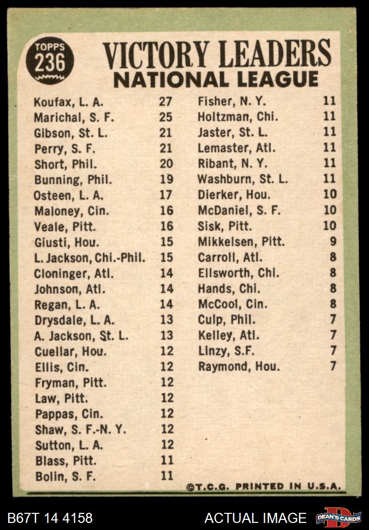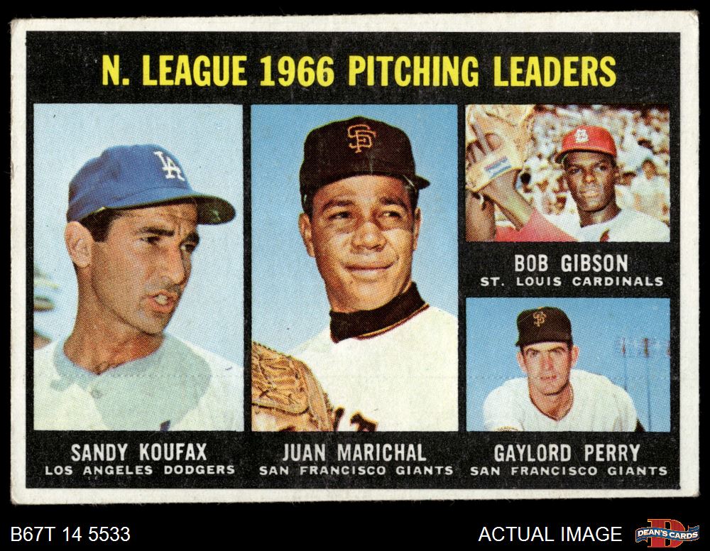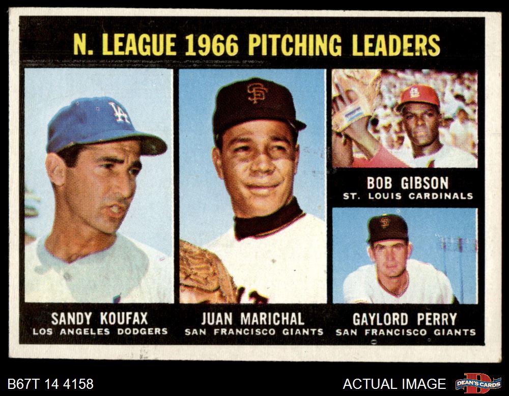 1967 Topps #236 - Bob Gibson / Sandy Koufax / Juan Marichal / Gaylord Perry NL Pitching Leaders 4 - VG/EX