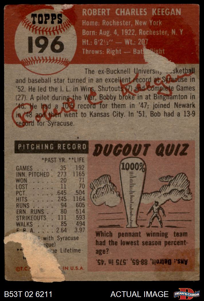 1953 Topps #196 Bob Keegan 1 - POOR
