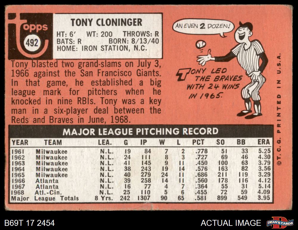 1969 Topps #492 Tony Cloninger Front Thumbnail