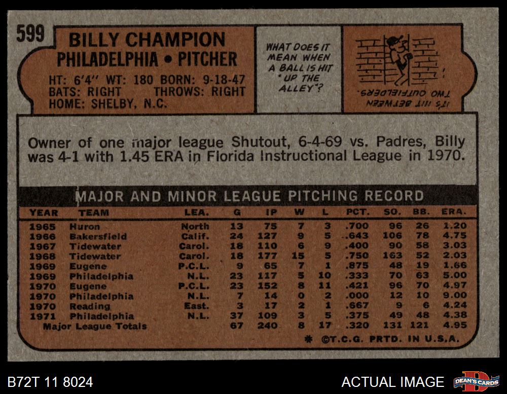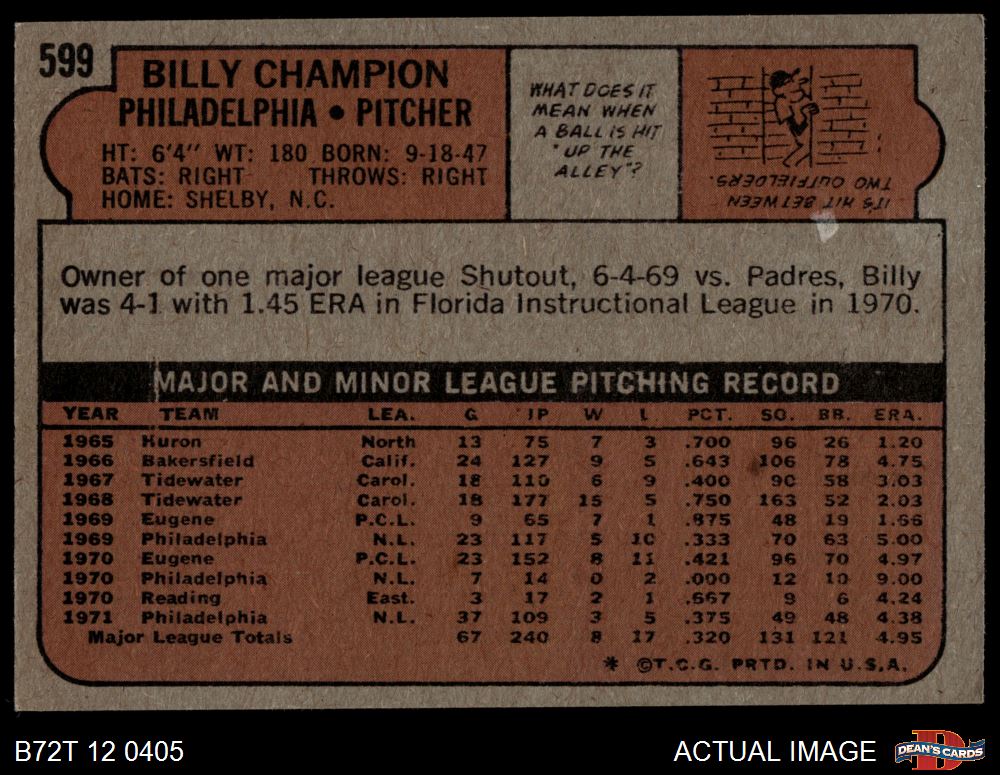 1972 Topps #599 Billy Champion 4 - VG/EX