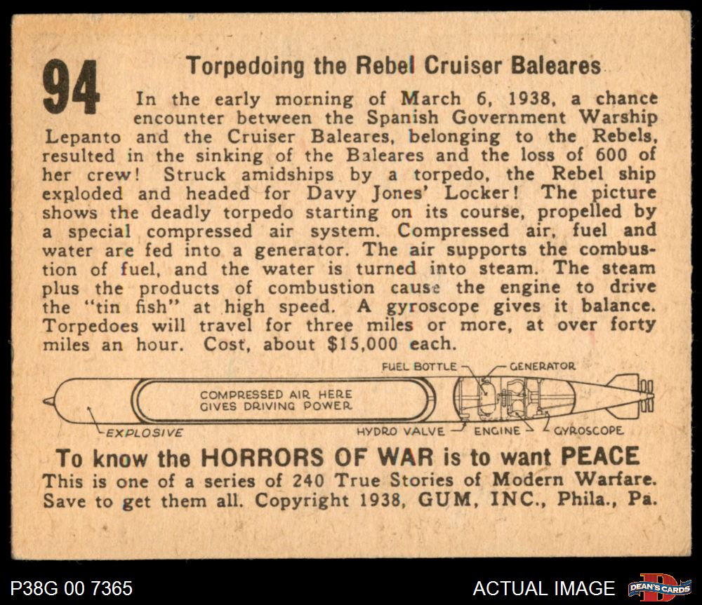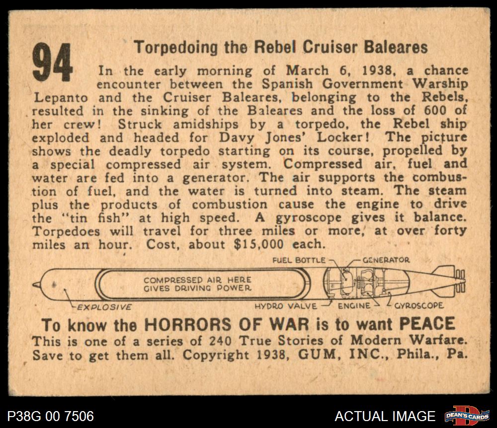1938 Horrors of War #94 Torpedoing the Rebel Cruiser Baleares 6 - EX/MT
