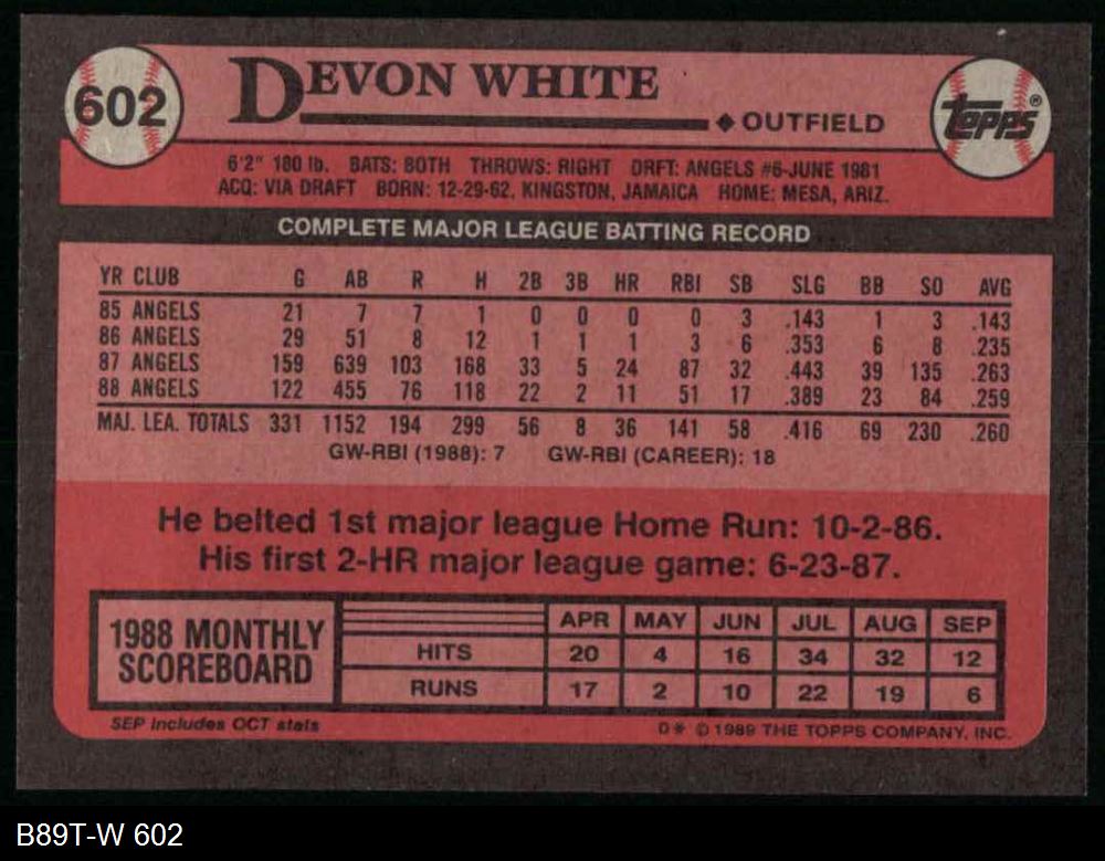 1989 Topps #602 Devon White 8 - NM/MT