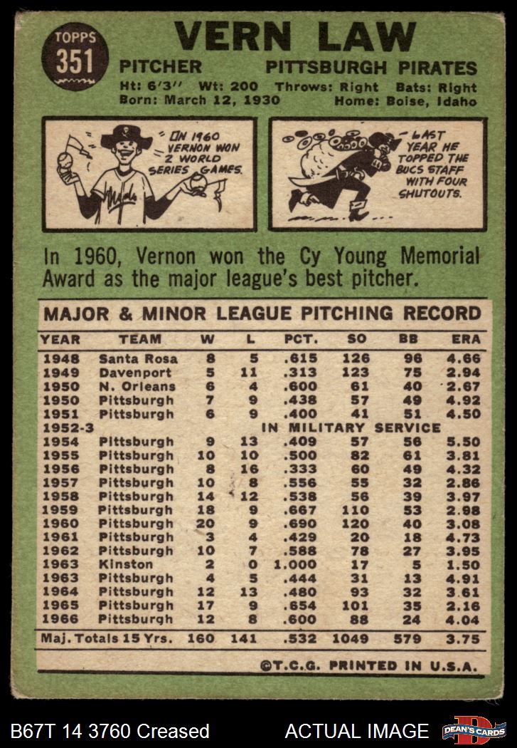 1967 Topps #351 Vern Law Front Thumbnail