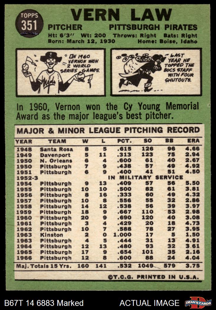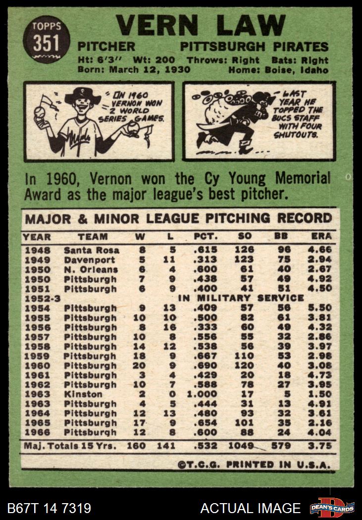 1967 Topps #351 Vern Law