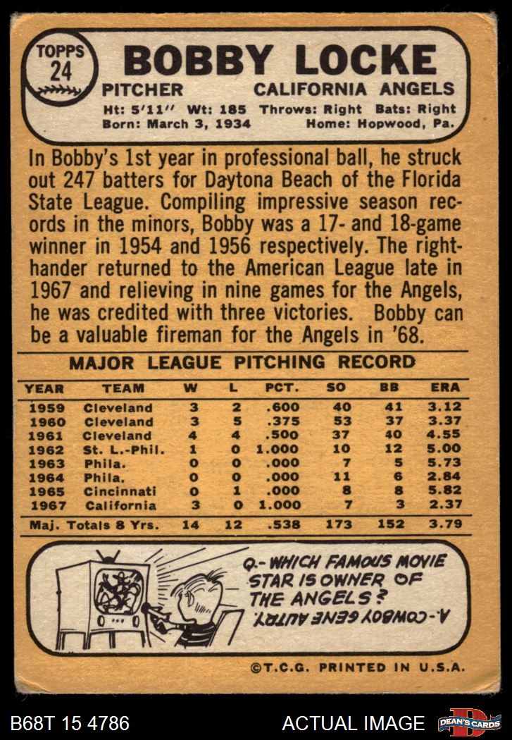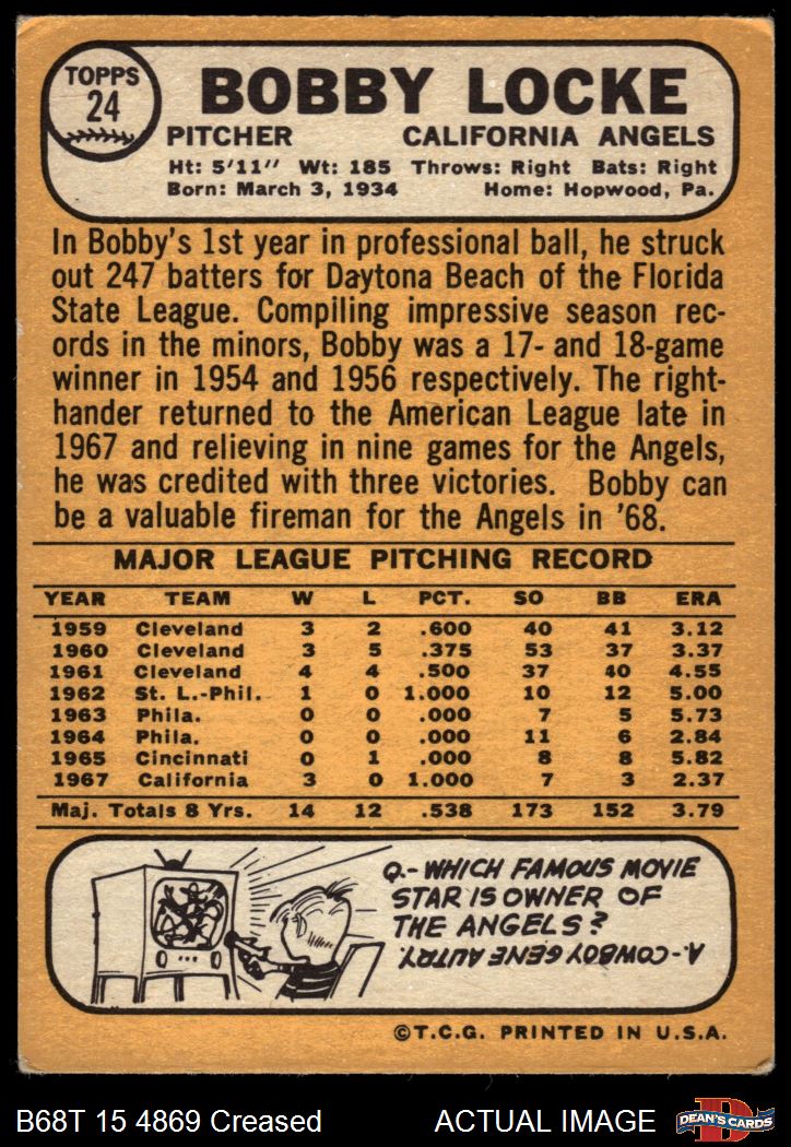 1968 Topps #24 A Bobby Locke 3 - VG