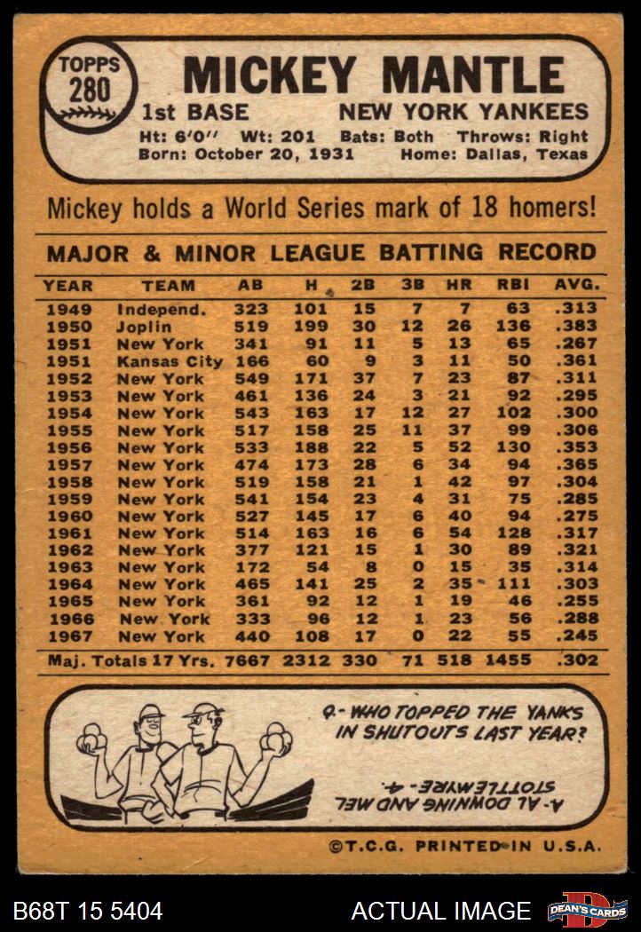 1968 Topps #280 Mickey Mantle 3 - VG