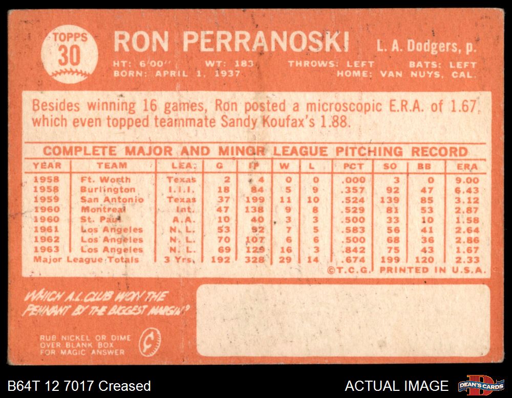 1964 Topps #30 Ron Perranoski 2 - GOOD