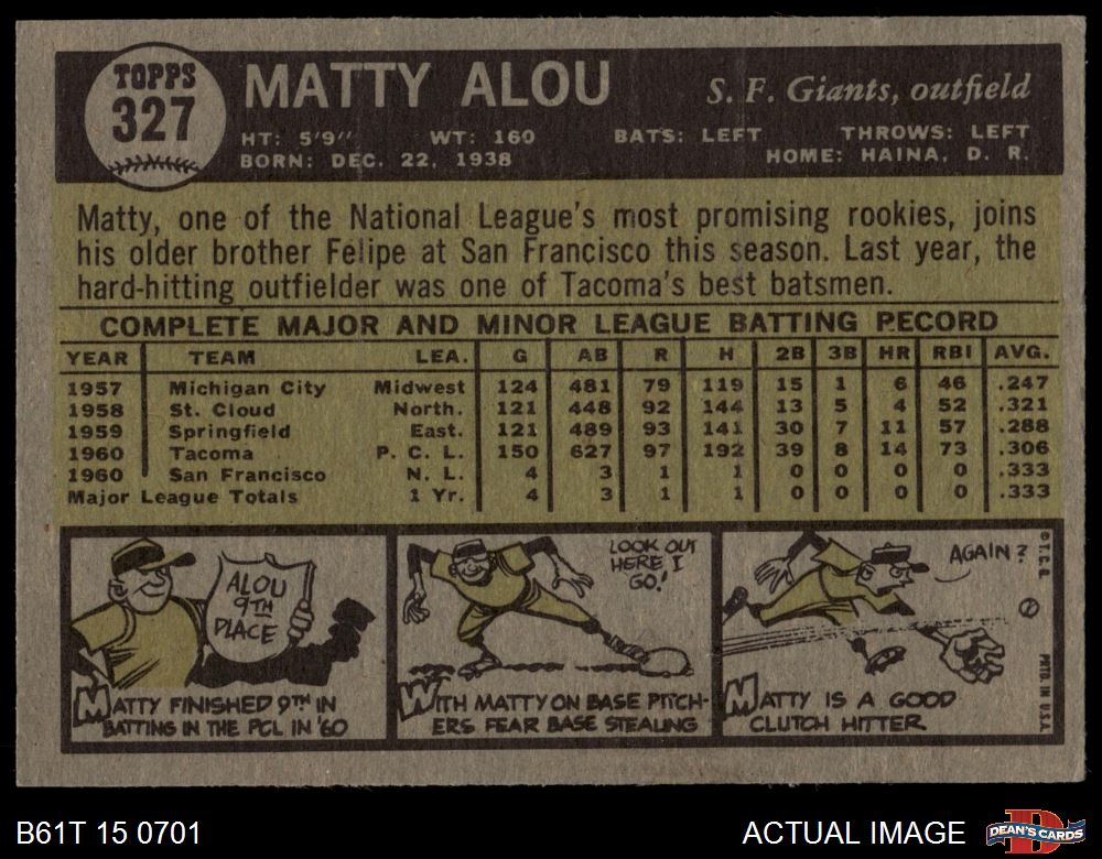 1961 Topps #327 Matty Alou 5 - EX