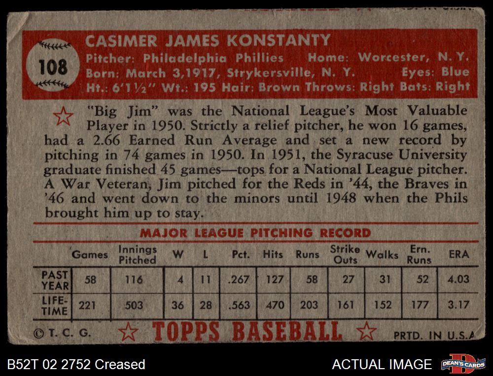1952 Topps #108 Jim Konstanty 2 - GOOD
