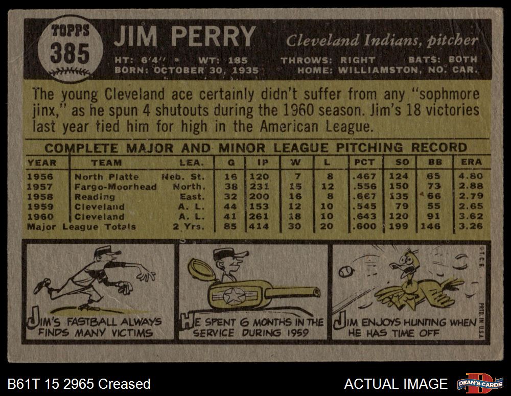 1961 Topps #385 Jim Perry 2 - GOOD