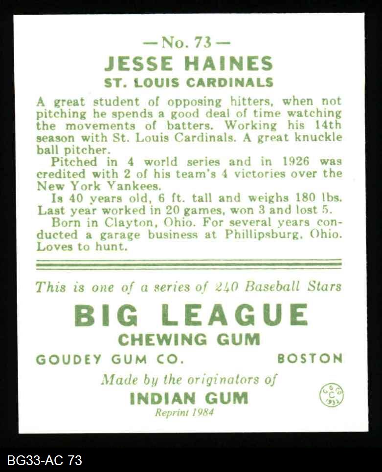 1933 Goudey Reprint #73 Jesse Haines 8 - NM/MT