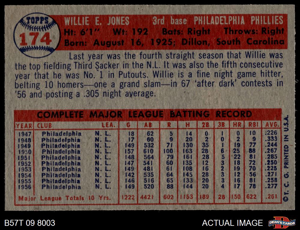 1957 Topps #174 Willie Jones 7.5 - NM+