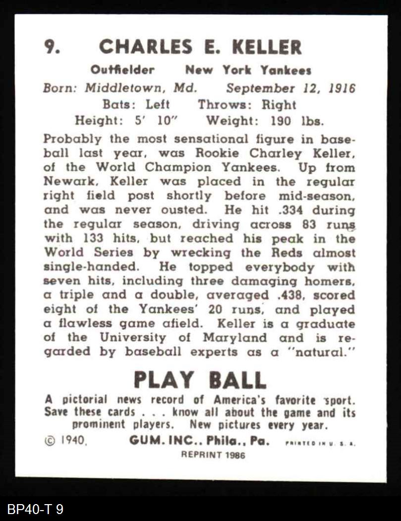 1940 Play Ball Reprint #9 Charlie Keller 8 - NM/MT