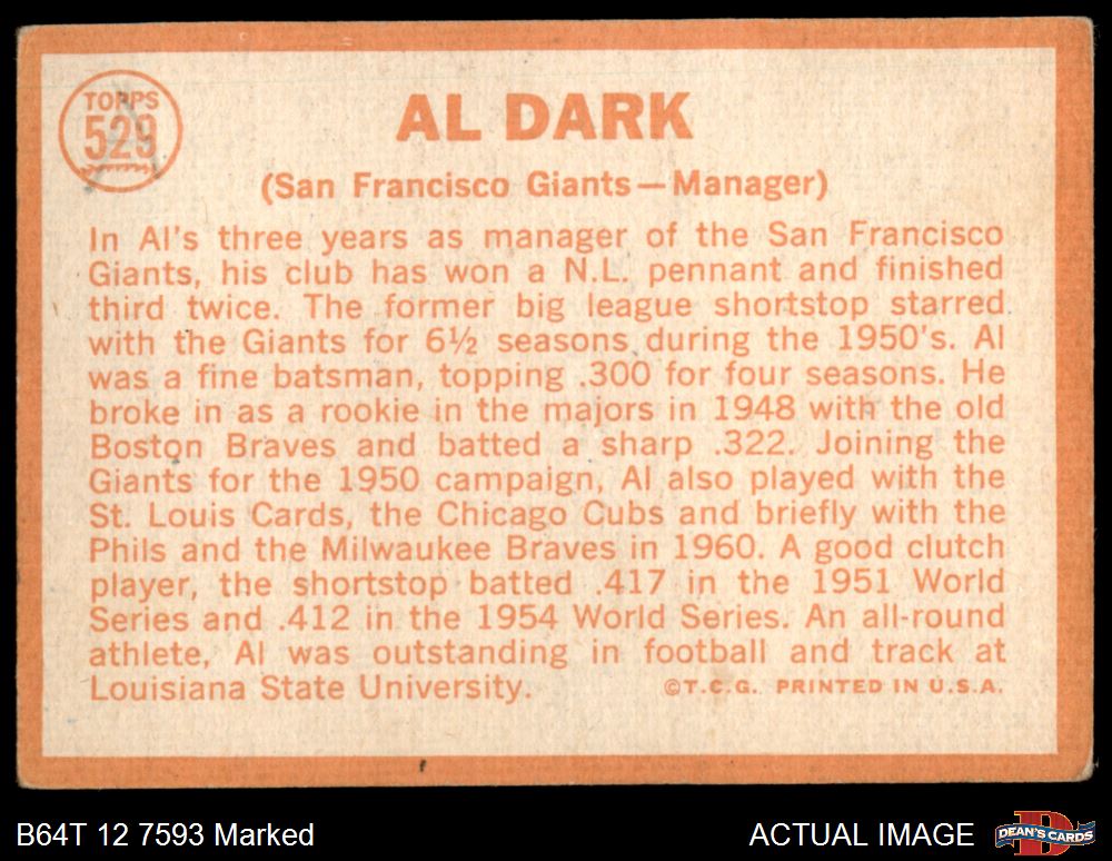 1964 Topps #529 Al Dark Front Thumbnail