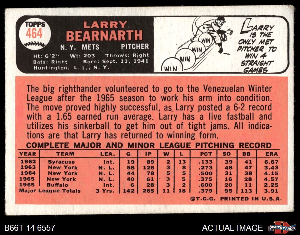 1966 Topps #464 Larry Bearnarth 3 - VG